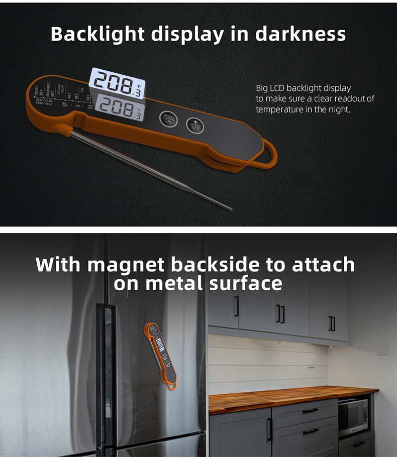 Þessi stafræni kjöthitamælir skilar hröðum, nákvæmum niðurstöðum með baklýstum LCD skjá, vatnsheldri hönnun og breiðu hitastigi (-50°C til 300°C) fyrir fullkomna eldamennsku í hvert skipti.